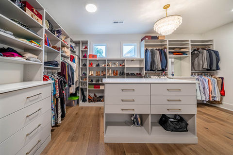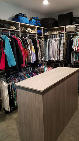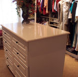 If your closet is big enough for an island, it is the most efficient use of the space in the center of the closet. Islands can be deceiving though because you have to consider walking space around all sides. Most of the time, we design drawers in islands. You need adequate space to pull the drawers out and still not interfere with the shelving or hanging on the wall behind. We custom make each island so we can come up with a creative solution in your space. We can make them any size so don’t hesitate to ask us if one will fit in your space.